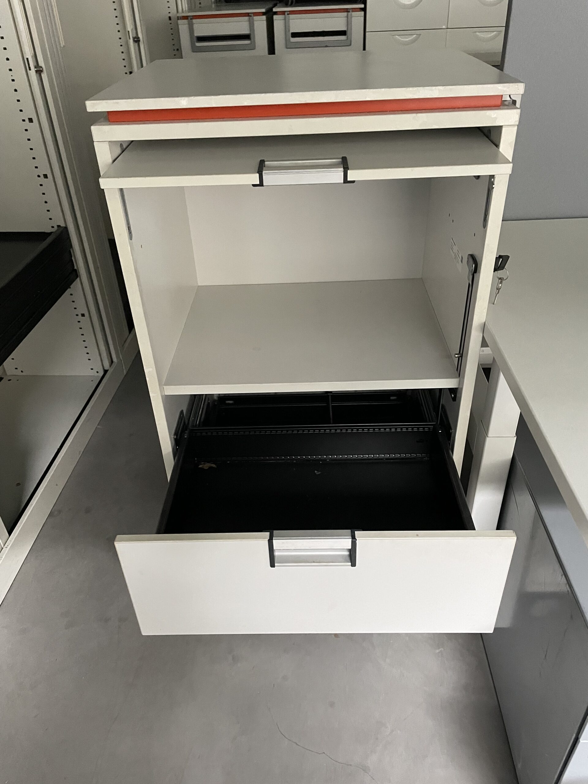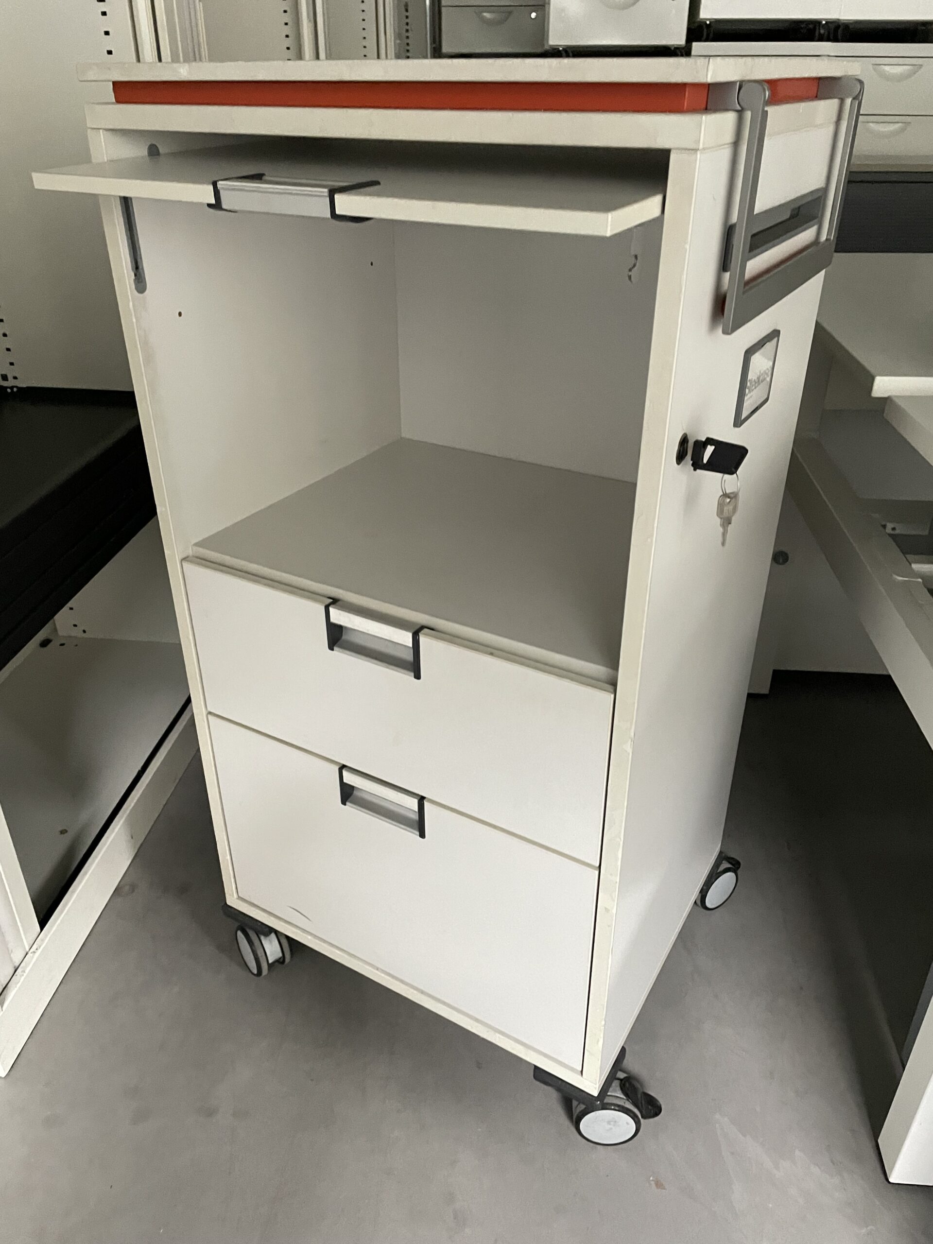 desserte Steelcase sur roulettes, hauteur 120 largeur 60, Profondeur 60? couleur Blanc. Trois compartiments. Poignées de déplacement. trappe courrier. Avec clé. Bon état